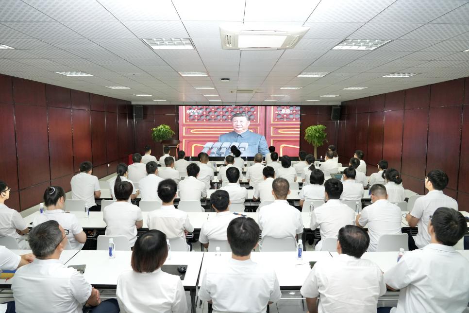 上午9时,员工们端坐在会议室,怀着激动的心情等待阅兵仪式开始。当习近平总书记宣布阅兵仪式开始,全体人员目光紧紧聚焦在大屏幕上,大家认真聆听习近平总书记的重要讲话,共同见证这一历史性时刻。